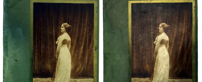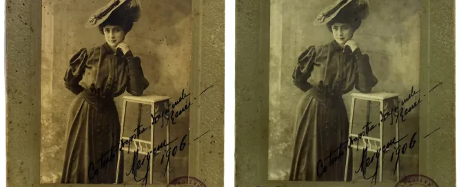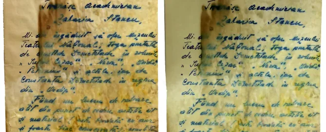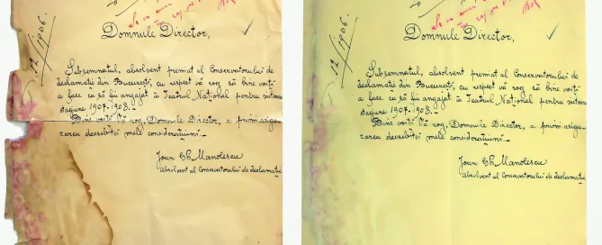Scroll for English Maria Giurgea, fotografie cu dedicație Atelier necunoscut, începutul secolului al XX-lea Fotografie cu passe partout din carton, realizată înainte de 1909. Reprezintă imaginea actriței Maria Giurgea (1877, Bârlad – 1949, București) și dedicația acesteia, scris autentic. Despre